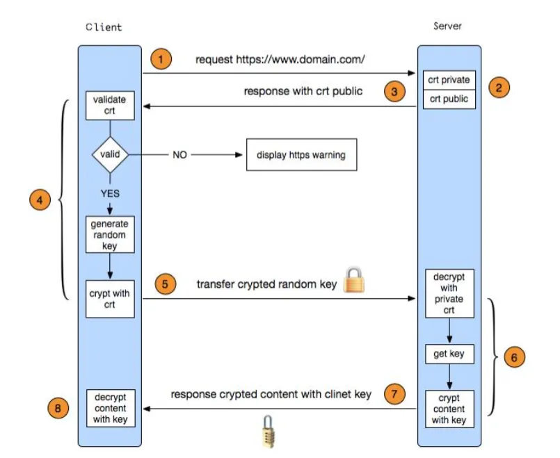 以https的通信建立为例,来分析非对称加密技术的使用,使用的非对称加密算法为RSA: