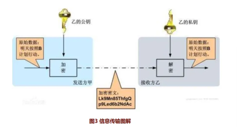 在传输过程中,即使攻击者截获了传输的密文,并得到了乙的公钥,也无法破解密文,因为只有乙的私钥才能解密密文。同样,如果乙要回复加密信息给甲,那么需要甲先公布甲的公钥给乙用于加密,甲自己保存甲的私钥用于解密。