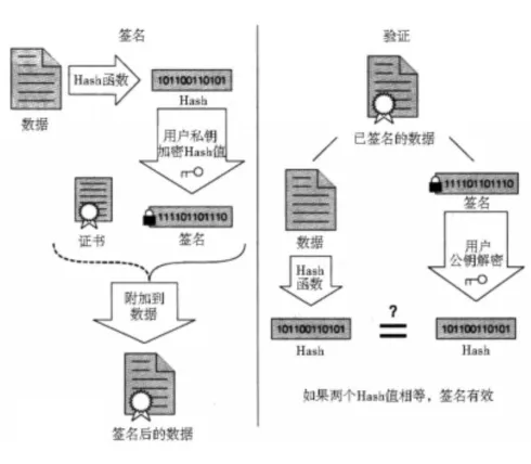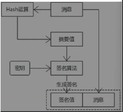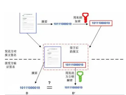 发送报文时,发送方用一个哈希函数从报文文本中生成报文摘要,然后用发送方的私钥对这个摘要进行加密,这个加密后的摘要将作为报文的数字签名和报文一起发送给接收方,接收方首先用与发送方一样的哈希函数从接收到的原始报文中计算出报文摘要,接着再公钥来对报文附加的数字签名进行解密,如果这两个摘要相同、那么接收方就能确认该报文是发送方的。